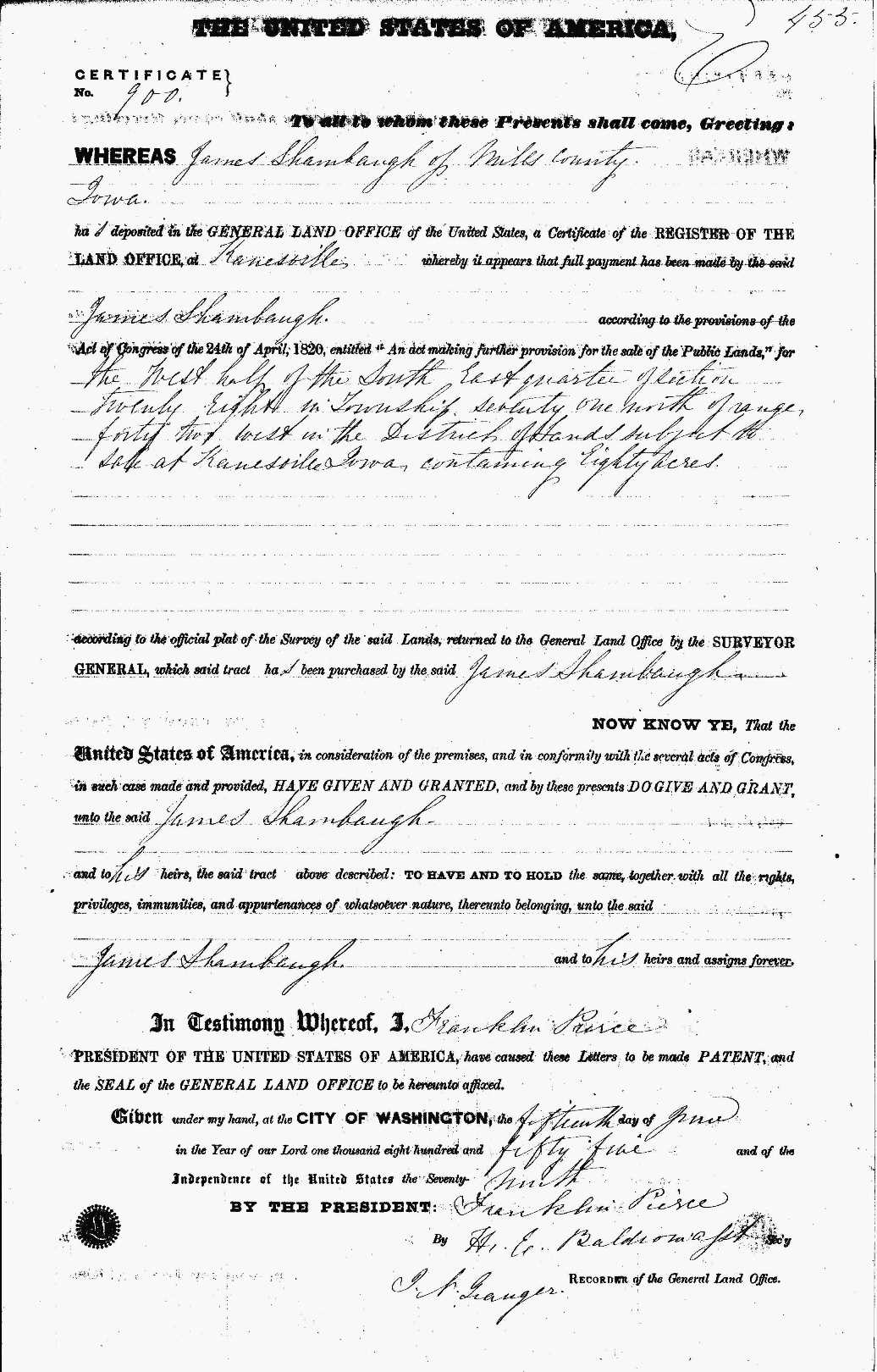 6/15/1855 - Certificate No. 900, James Shambaugh of Mills County, Iowa